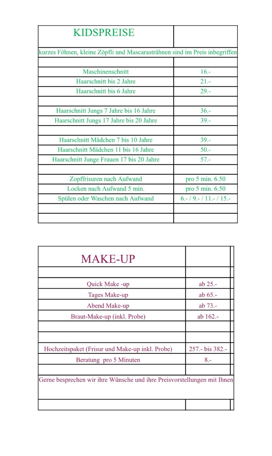 Preise (CHF inkl.MwSt.) richten sich nach Produkteaufwand und Zeit..